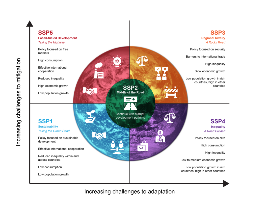 In CMIP6, they evolved into SSPs — Shared Socioeconomic Pathways — which combine both human and physical dimensions of climate change