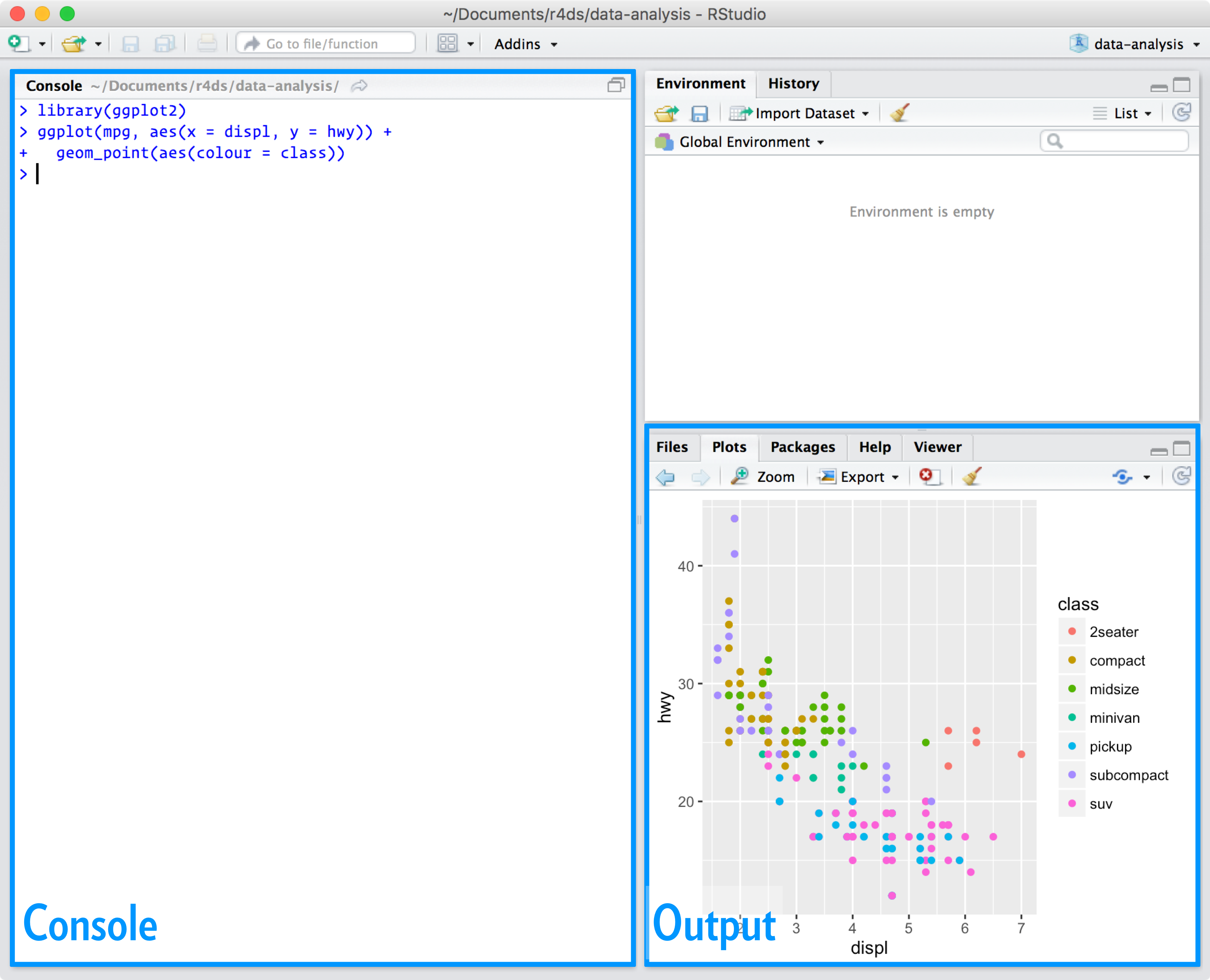 RStudio is an integrated development environment (IDE). In other words, it is a program that is designed to make your R programming experience more enjoyable. During this workshop, you will interact with R through RStudio—meaning that you will open RStudio to code in R. You can download the latest version of RStudio here: http://www.rstudio.com/download. When you start RStudio, you will see two main parts of the interface: