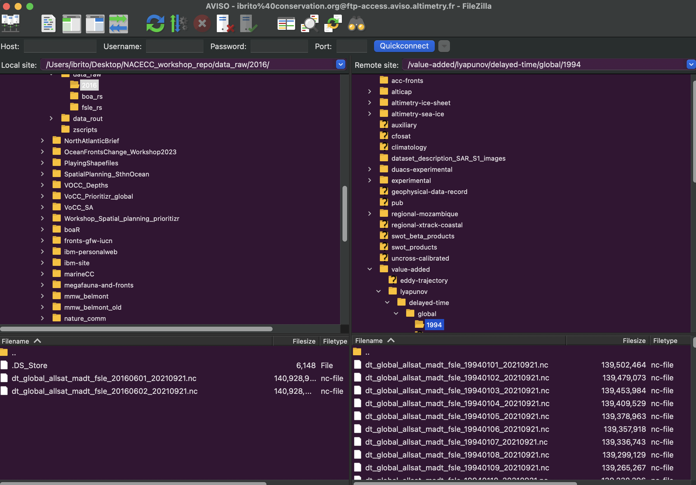 For the purpose of this workshop and to demonstrate how to use CDO (Climate Data Operators) and ncview, I have included two netCDF files of dynamical fronts (i.e., FSLE - Finite Size Lyapunov Exponent) in the workshop repository you have already cloned. These files are located in the data_raw/2016 directory.