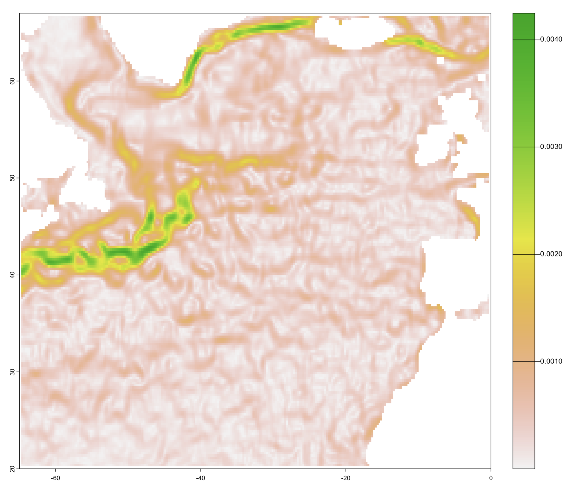 Thermal fronts are typically derived from remotely sensed sea surface temperature (SST) data. While this eBook does not cover this specific type of data, calculating thermal fronts is essentially based on estimating thermal gradients. In the R package terra, you can estimate the thermal gradient on any raster by simply using the slope argument in the terra::terrain() function. This approach allows you to identify areas where the temperature changes rapidly over space, in which high values corresponds to thermal fronts.