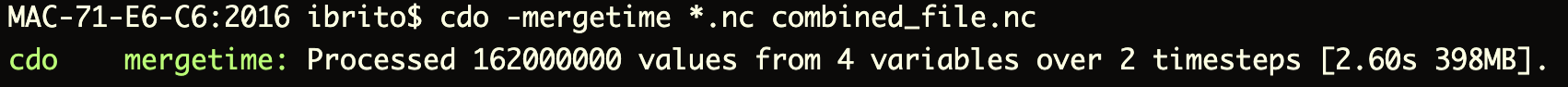 Using CDO to merge files is simple. We will have to use -mergetime operator in the directory. For example, using the terminal or the RStudio terminal tab: