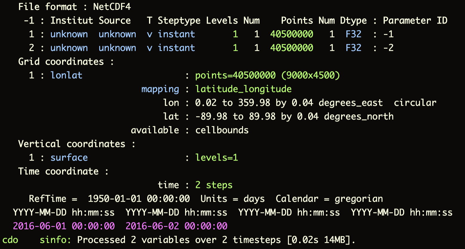 To check the structure of the new combined_file.nc file, we will use the -sinfo operator. In the same directorty data_raw/2016/, type (using the terminal or the RStudio terminal tab):