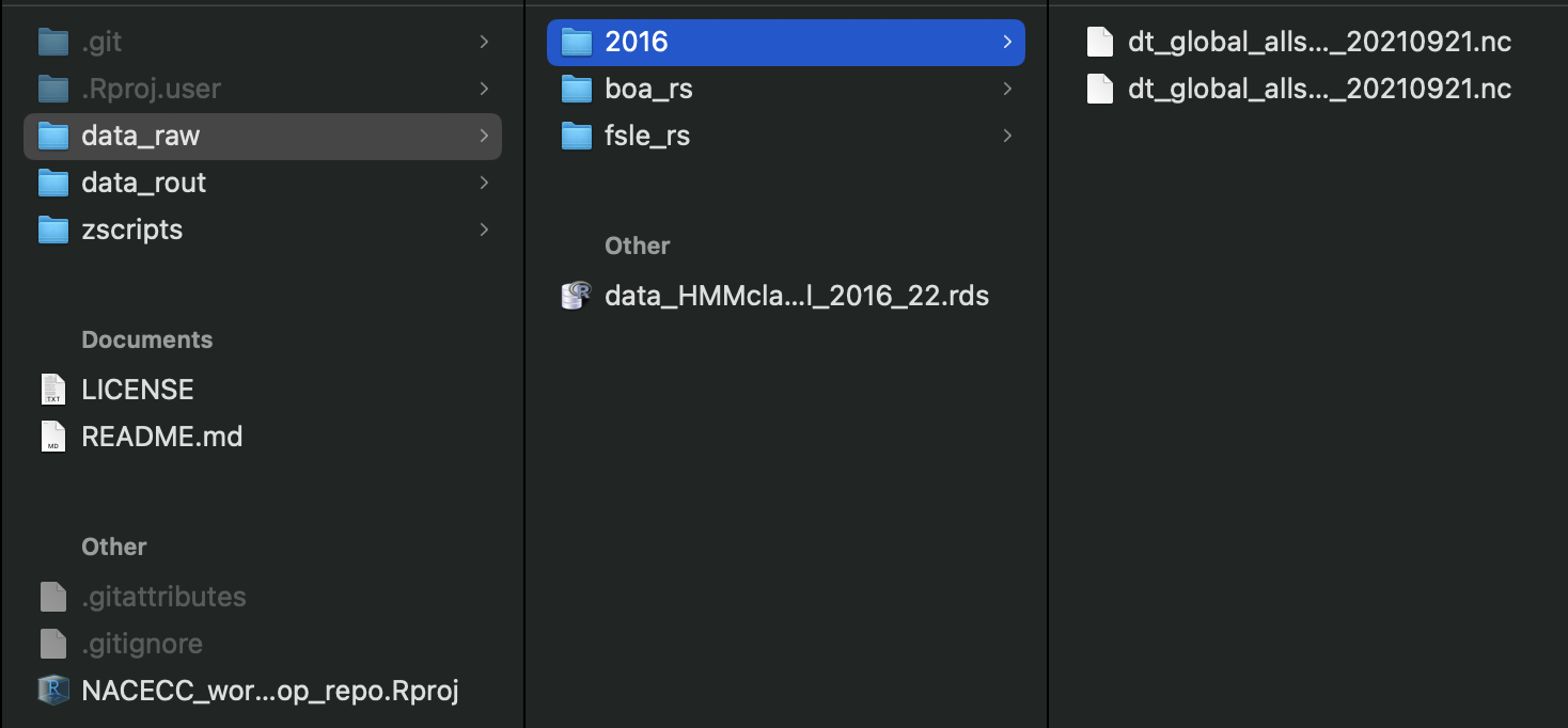 This is the structure of the NACECC_workshop_repo repository that we have cloned. I did not include all the AVISO files; as an example, we will work with only 2 files. You can repeat the same exercise with however many files you have for your projects.